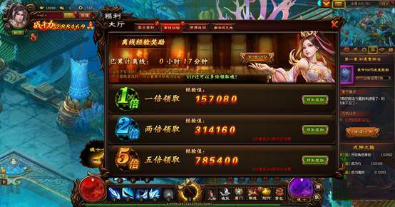 4、离线经验,是系统在玩家离线的情况下,累计补偿经验的机制。玩家偶尔有事无法登录游戏,就可以在次日登录游戏领取奖励啦。但是最多只能累计12小时的离线经验,所以还是要及时登录游戏呢!当然,如果觉得经验太少,也没关系,VIP玩家最高可以获得5倍的离线经验,真是羡煞旁人呢!